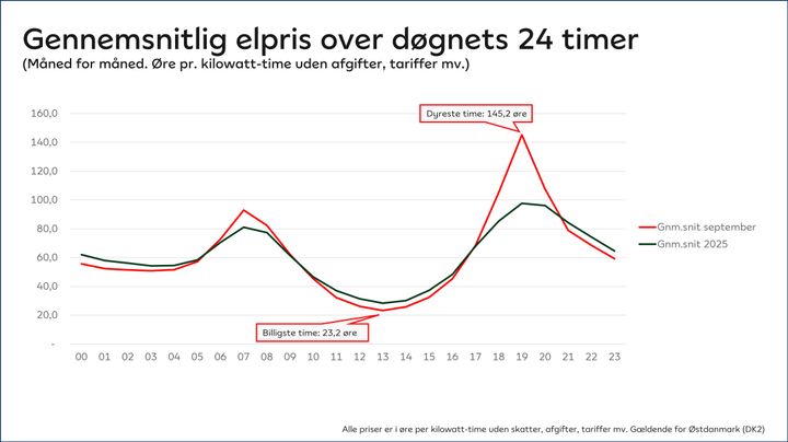 ”Når vi analyserer de rå elpriser hen over døgnet, tegner der sig et tydeligt mønster. I de første ni måneder af 2025 er det i timen mellem kl. 13 og 14, at elprisen er billigst. Her er gennemsnitsprisen ca. 28,3 øre per kilowatt-time. Modsat kan vi se, at prisen topper mellem 19 og 20. Her er elprisen i gennemsnit ca. 145 øre før skatter, afgifter og nettariffer,” siger Josefine Walter.